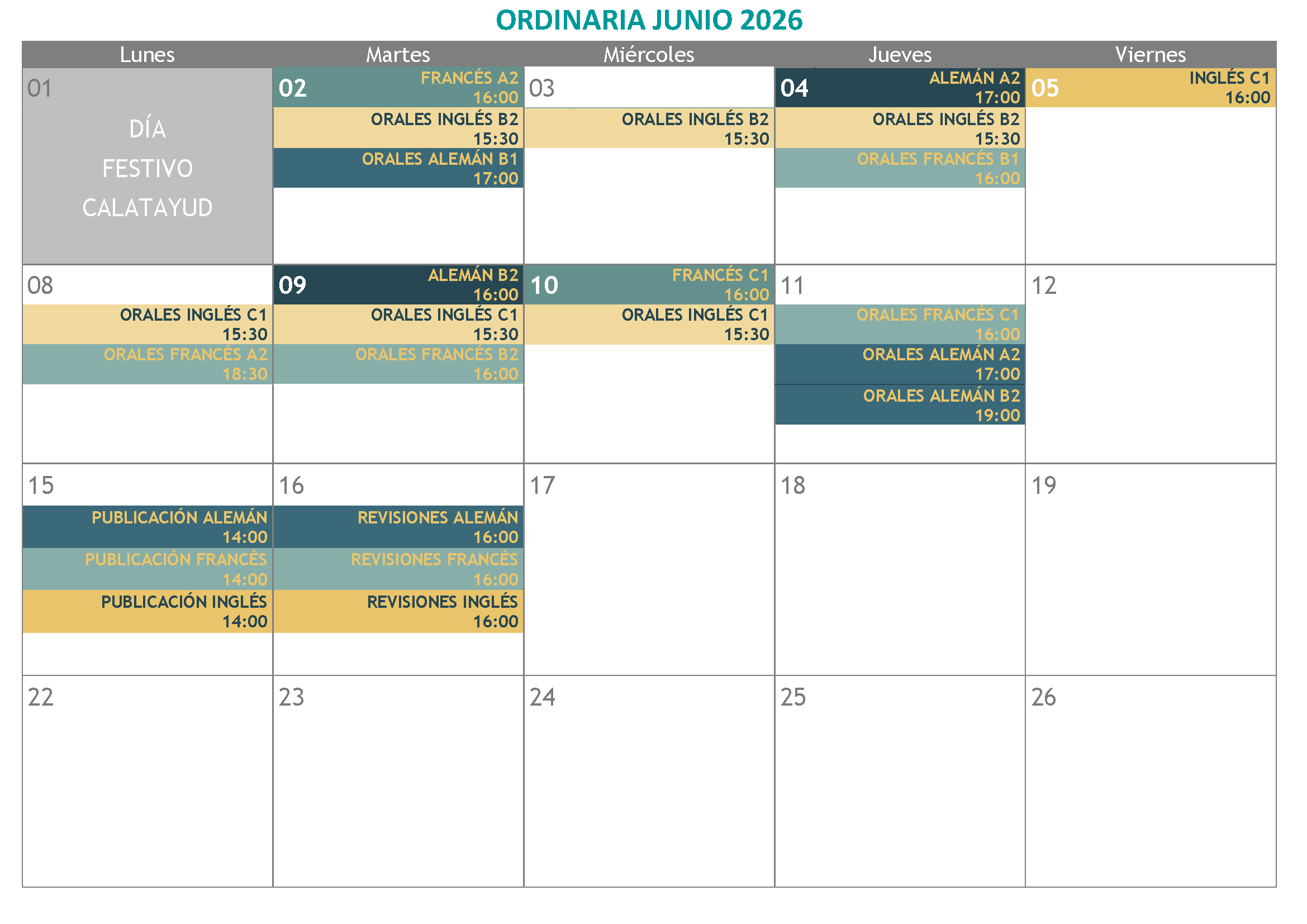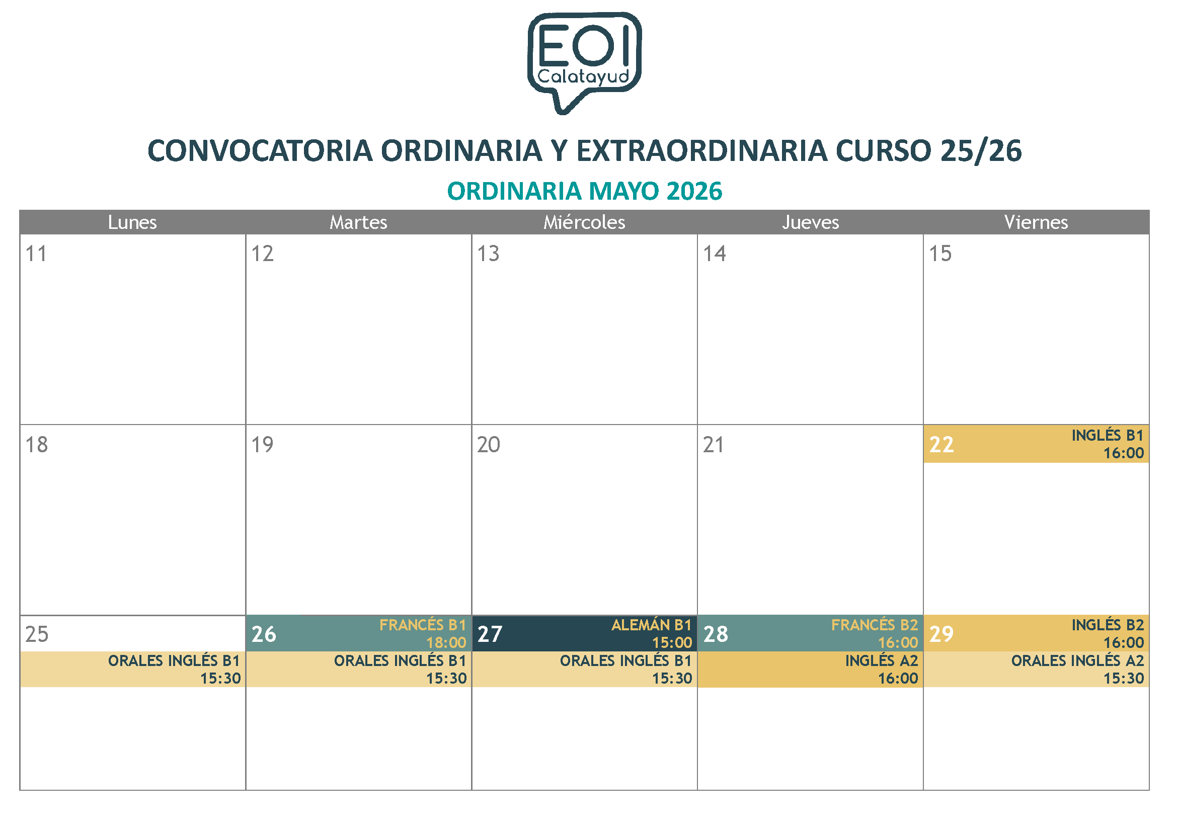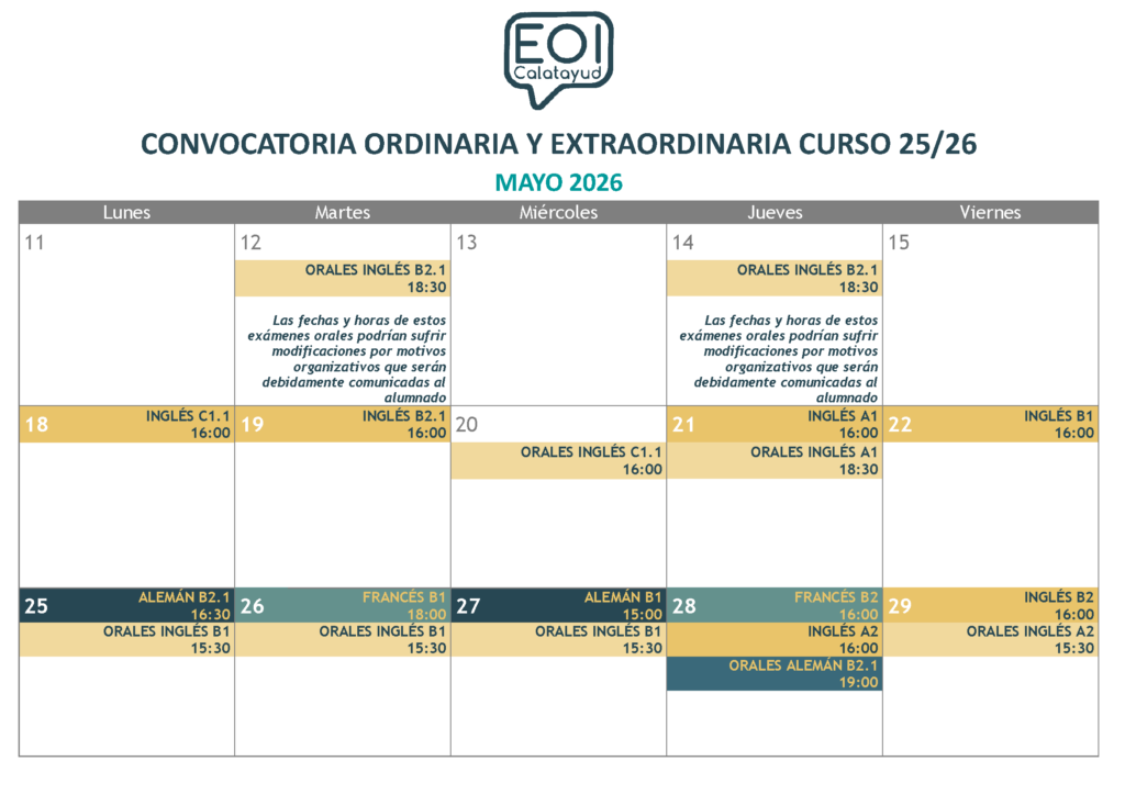Si miras el calendario completo, puede que veas demasiadas convocatorias y niveles. Eso es porque se incluyen las Pruebas de Certificación de todos los idiomas (donde se presentan el alumnado oficial y también el libre) y exámenes de Cursos no conducentes a certificación, donde sólo se presenta el alumnado oficial.