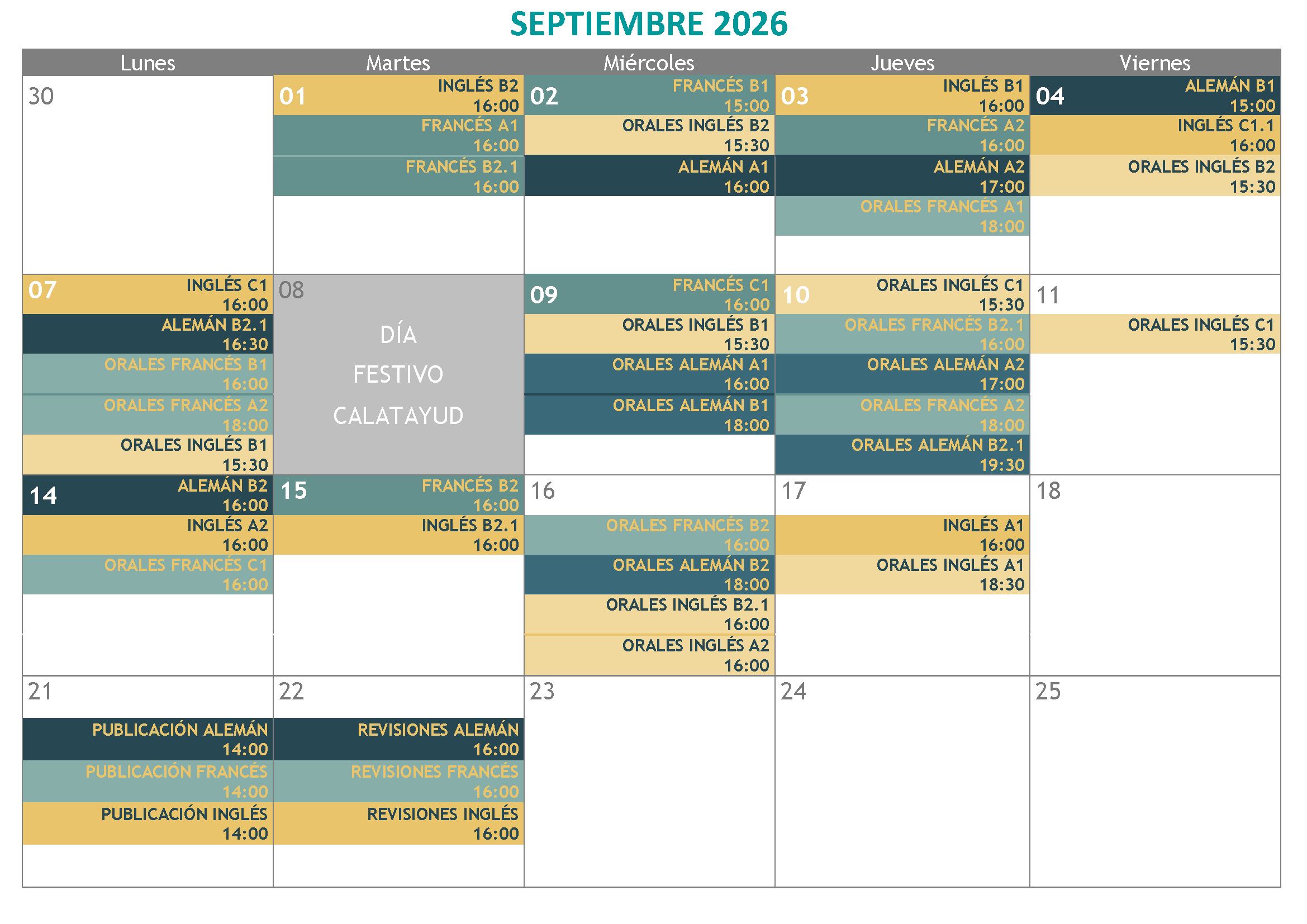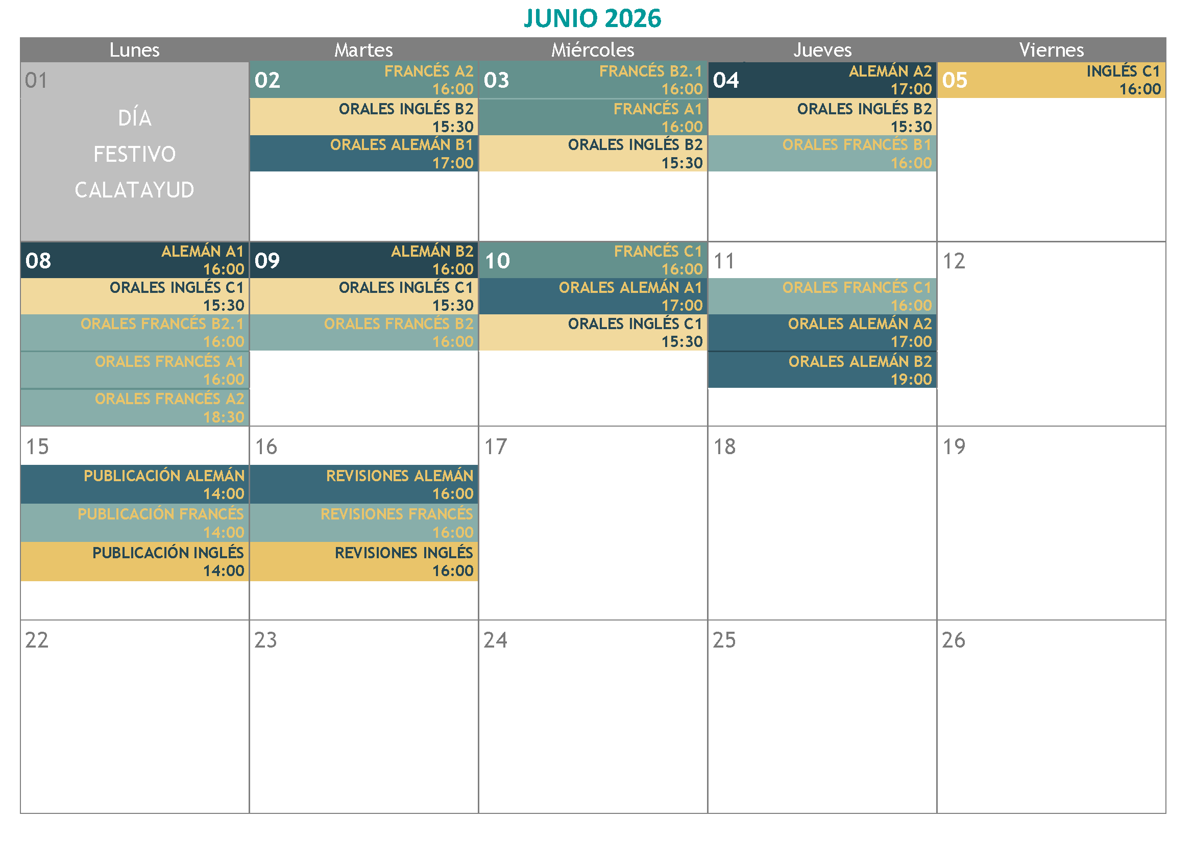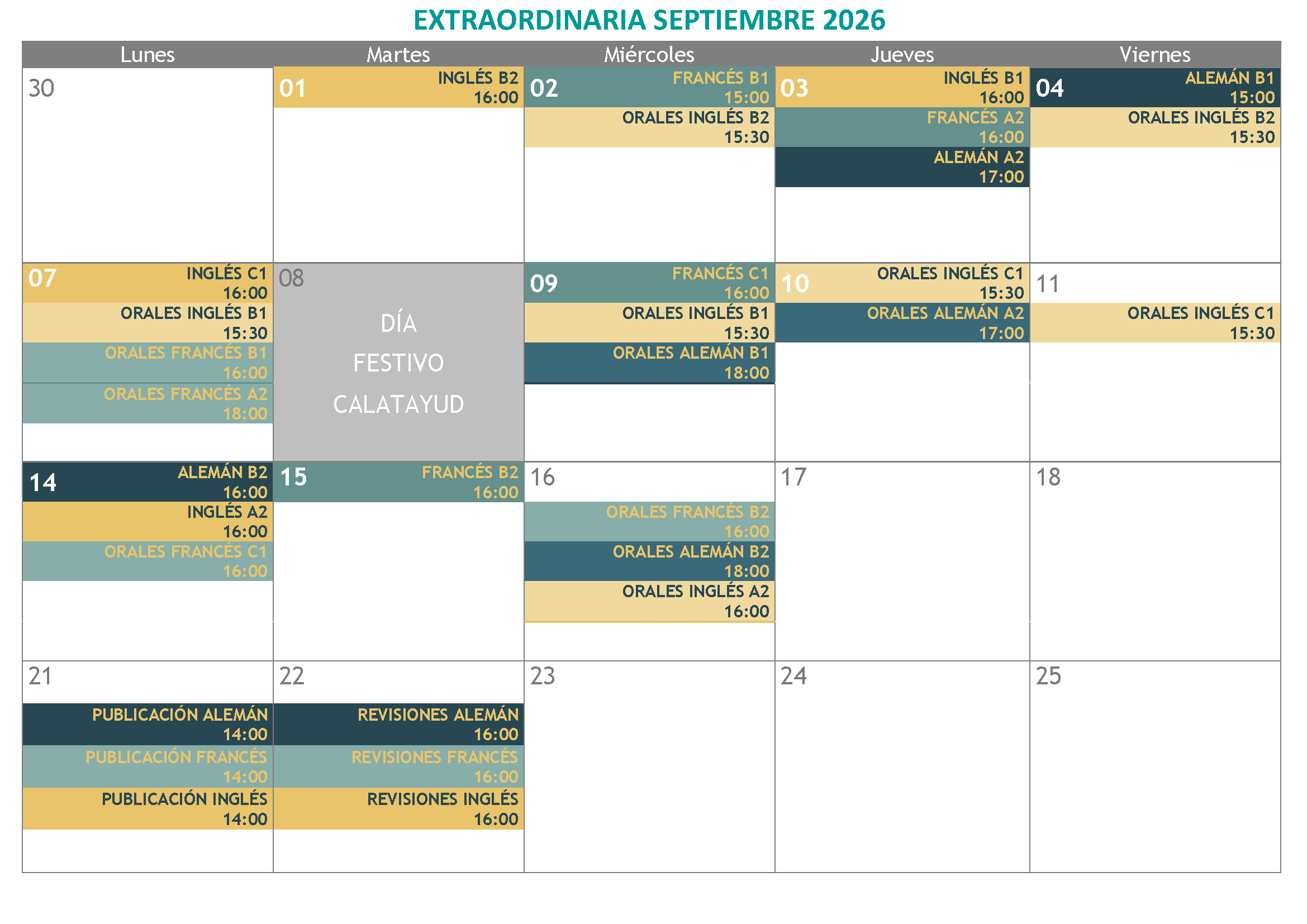 Si miras el calendario completo, puede que veas demasiadas convocatorias y niveles. Eso es porque se incluyen las Pruebas de Certificación de todos los idiomas (donde se presentan el alumnado oficial y también el libre) y exámenes de Cursos no conducentes a certificación, donde sólo se presenta el alumnado oficial.
