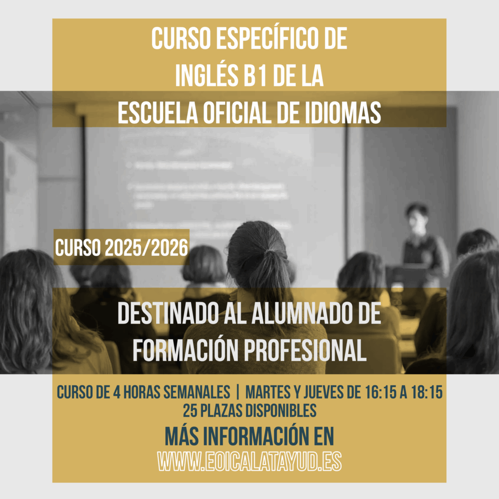 La Escuela Oficial de Idiomas de Calatayud oferta al alumnado de formación profesional este curso específico de inglés nivel B1 con la intención de complementar y reforzar los contenidos de inglés impartidos en sus respectivas especialidades.