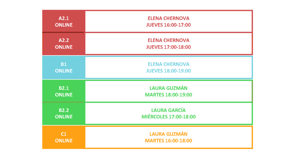 Una vez formalizada la matrícula recibirás el material correspondiente al curso (los libros de texto y el acceso a la Plataforma Virtual e-learning). Después, te preparas por tu cuenta y a tu ritmo y dispones de una tutoría online de 1 hora a la semana (o 2 horas sí es en nivel C1), que se realiza a través de plataformas virtuales que los tutores te indiquen.